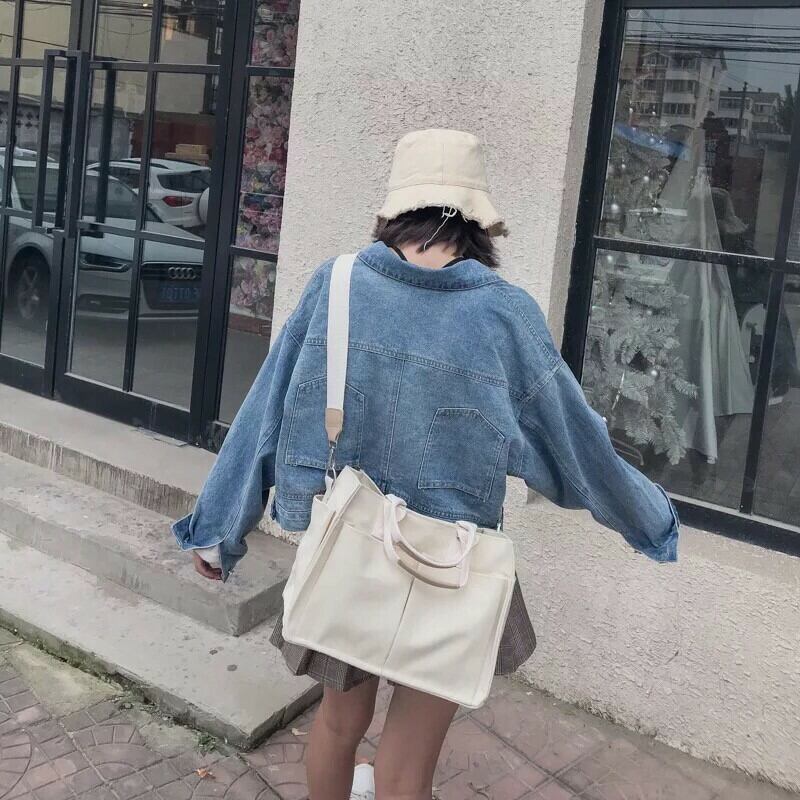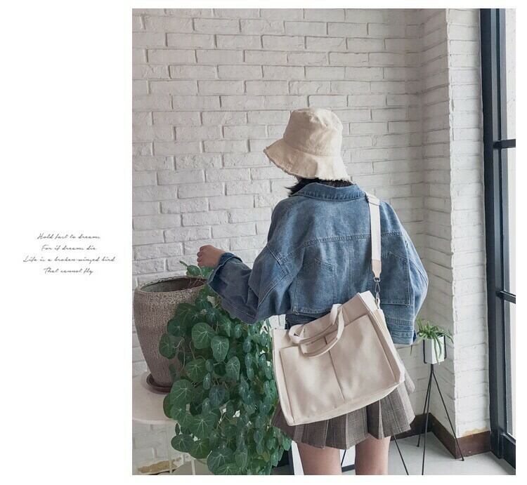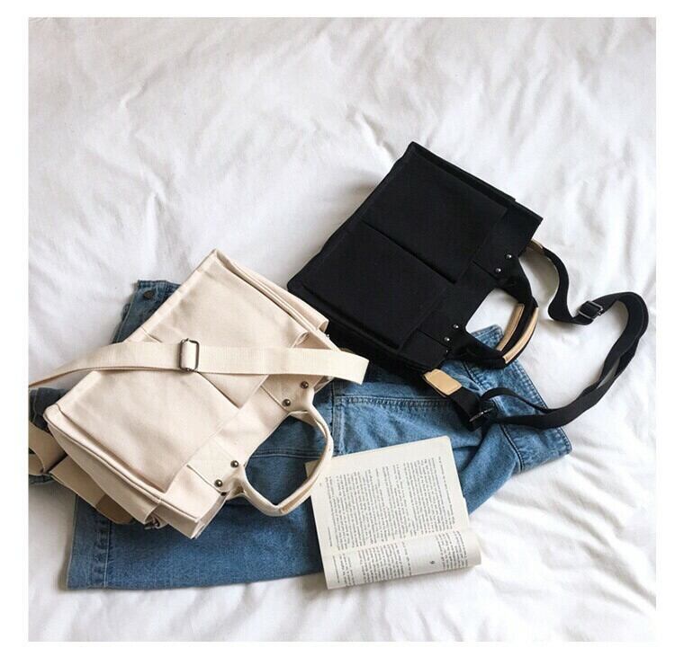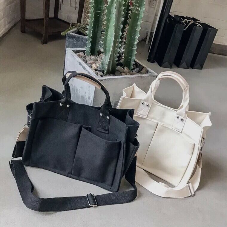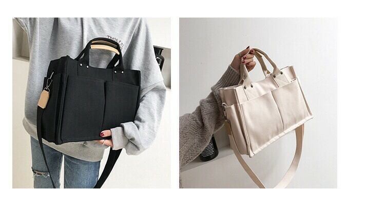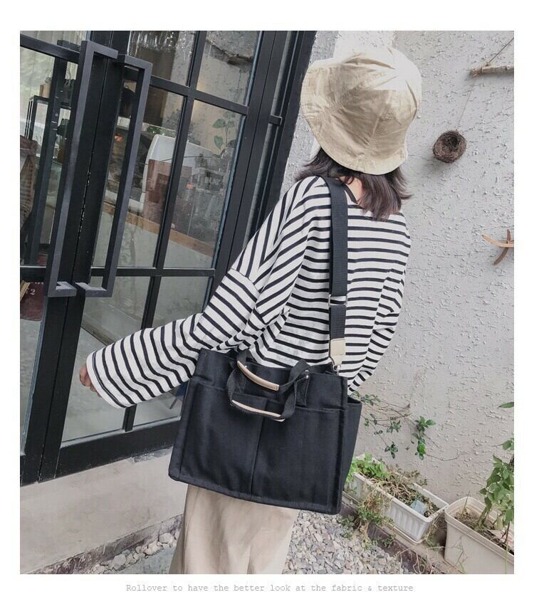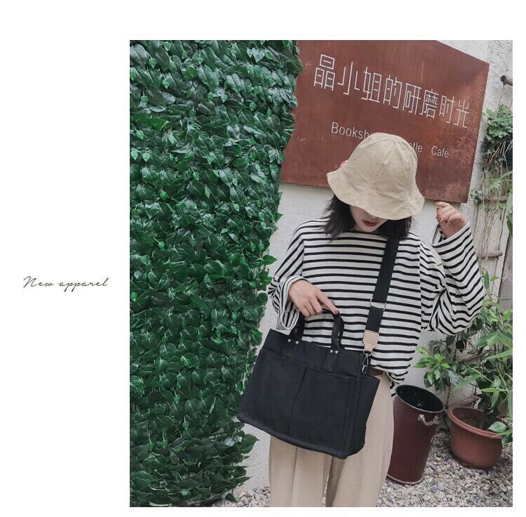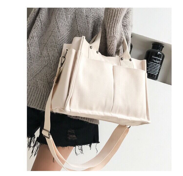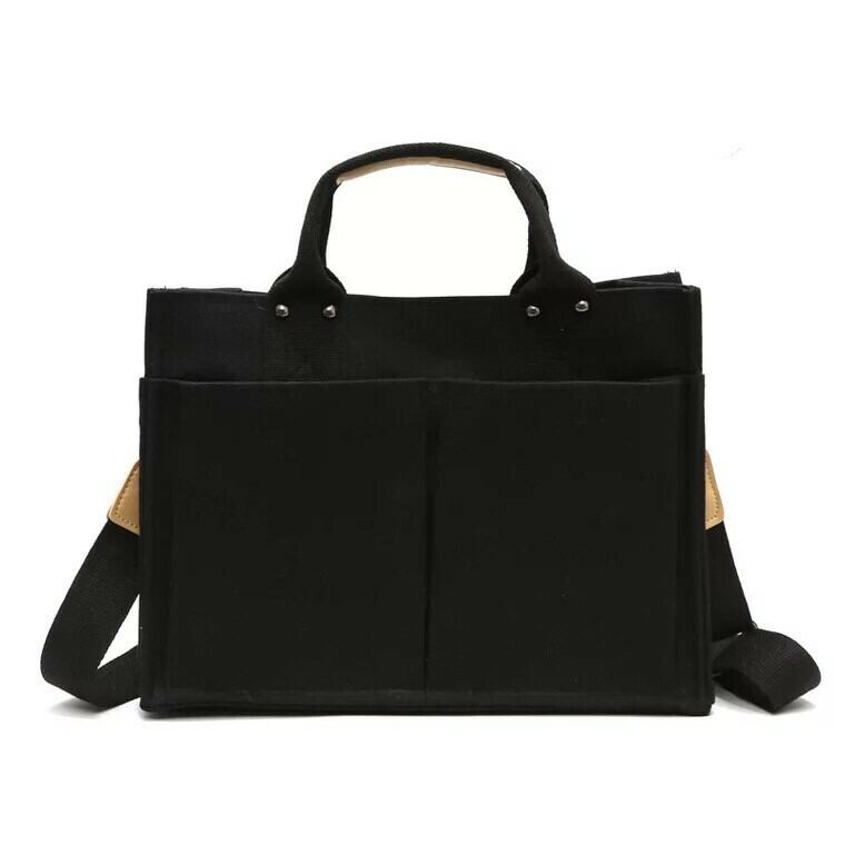 大きいポケットが両面に4つ、側面に2つの合計6つ付いている、A4サイズも入る使い勝手が良いトートバッグです❤️
