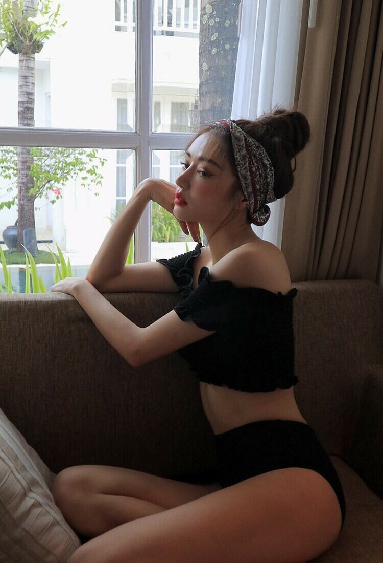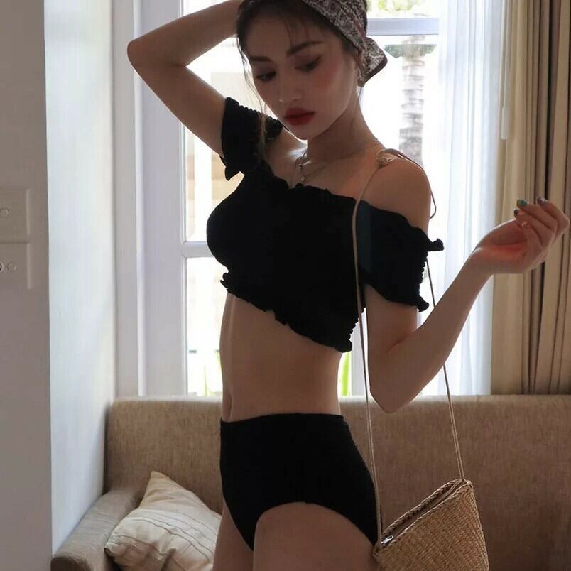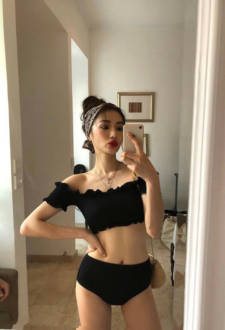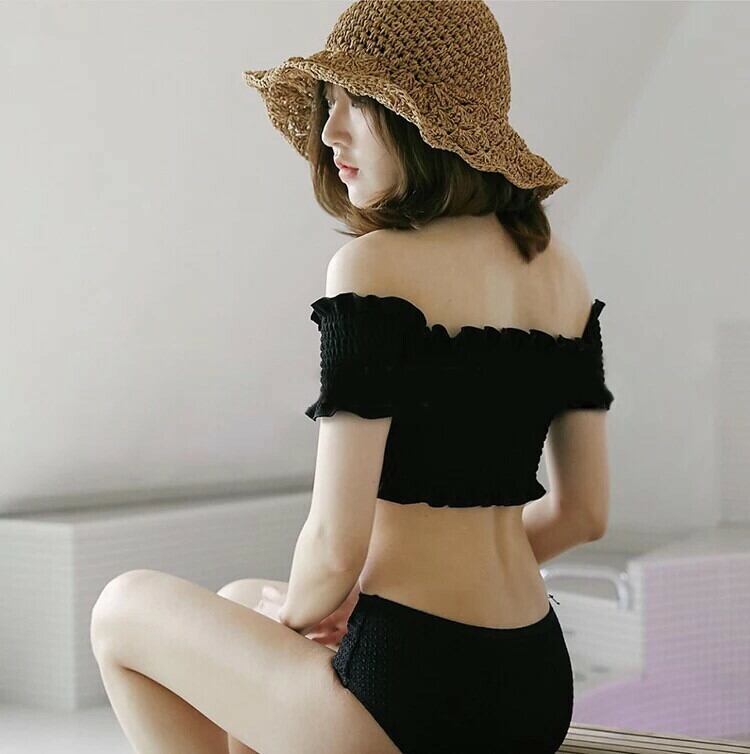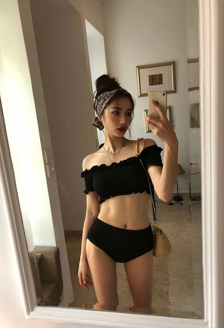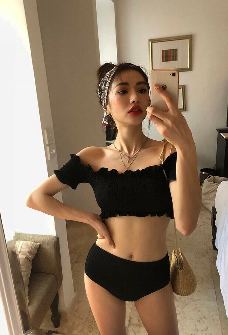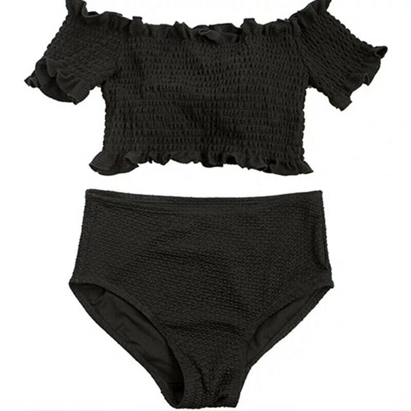 トップスにはフリルと、二の腕もカバーできちゃうのが嬉しいデザインになっていて、ボトムスはハイウエストでシンプルに!立体的ポコポコした素材で、水着独特のテカリがありません❤️